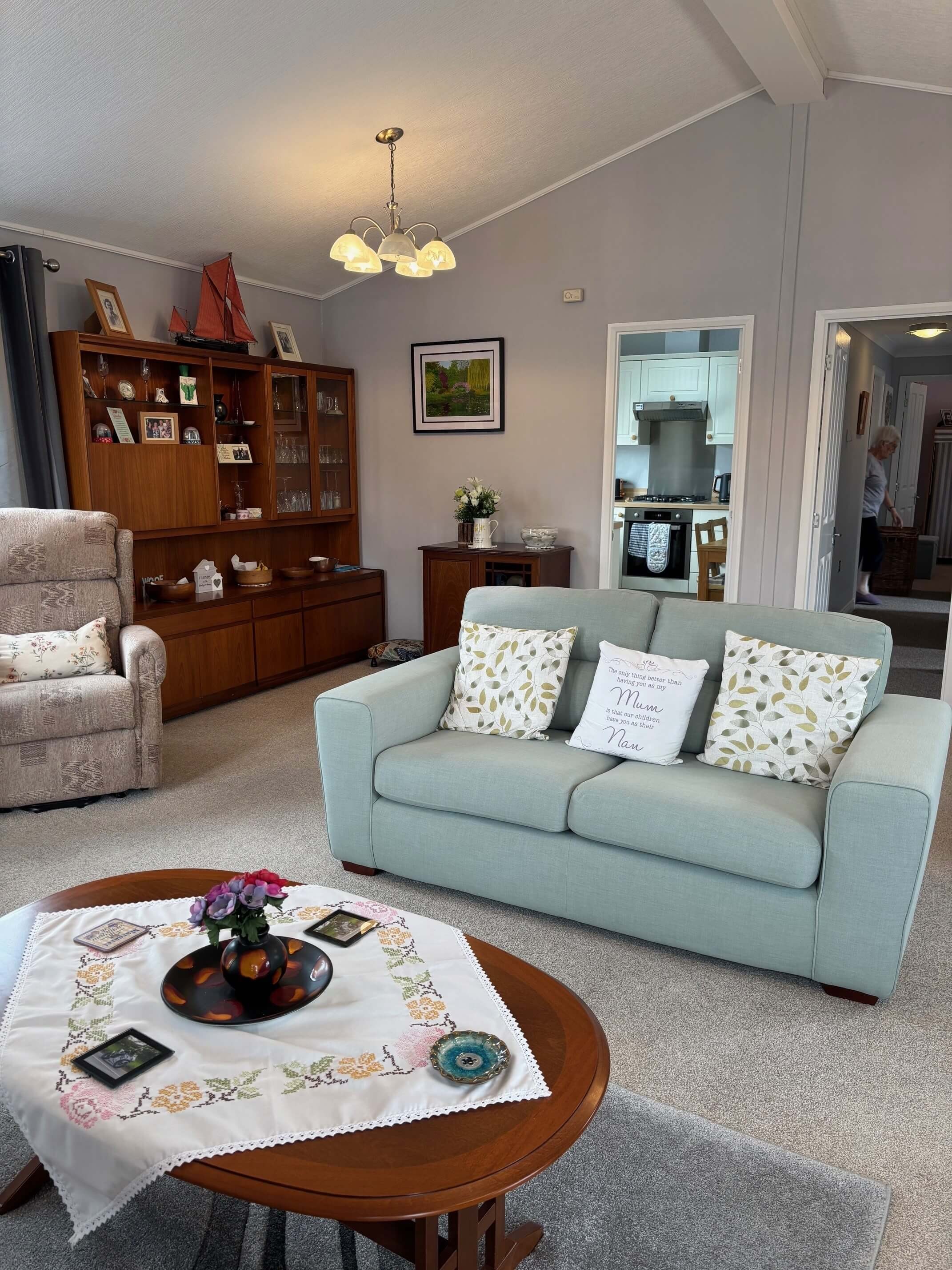 An exciting opportunity has arisen to purchase this two-bedroom Cosalt Essence 38 x 20 lodge, with an extended decking area laid with Astro Tuft.