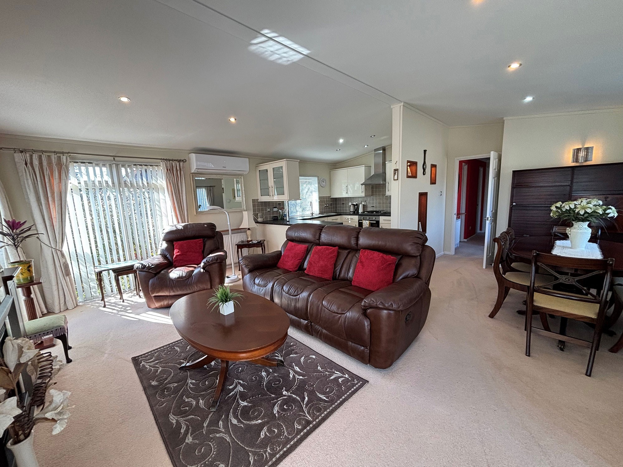 The open plan living space is beautifully designed, offering a very practical layout with a dedicated dining area, large lounge and a well-equipped kitchen. The kitchen has ample storage and workspace and is fitted with integral washing machine.